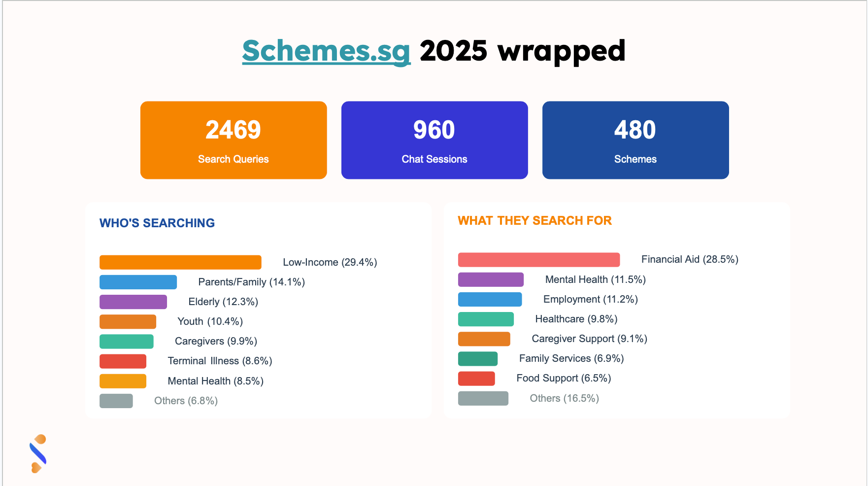 After five years of iteration, the team presented a striking set of numbers. As of 2025, Schemes.sg has 2,469 search queries, 960 chat sessions, and coverage across 480 schemes. The most common seekers were those with low incomes (29.4%), followed by parents and families, the elderly, and youth. What they were mostly searching for: financial aid, mental health support, and employment assistance.