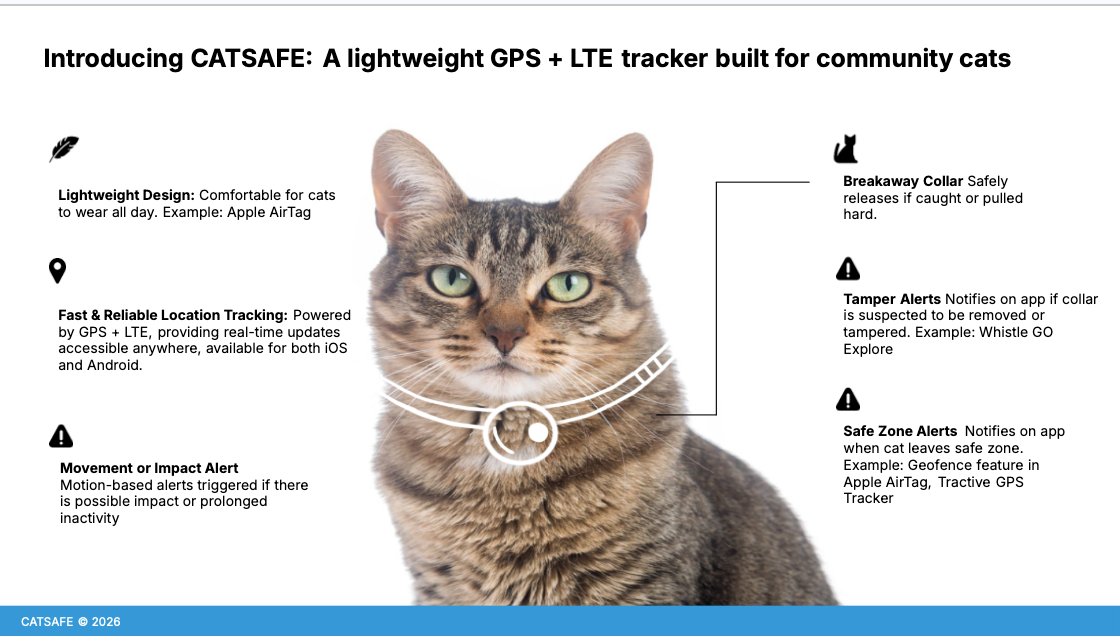 Catsafe is a ground-up initiative building a lightweight GPS + LTE smart tracker specifically designed for community cats. Unlike consumer options like Apple AirTags, which rely on iPhones, don't support multi-caregiver coordination, and lack tamper alerts, Catsafe is purpose-built for the realities of community cat caregiving.